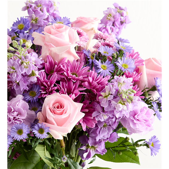 EXCLUSIVE Just like a daydream. Our delightful lavender bouquet is gathered with accents of pink and lush greenery in an embossed lavender vase that complements the delicate beauty of the blooms.